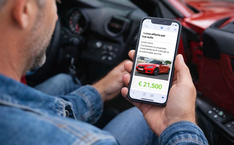 Basta venditori indecisi con valutazioni approssimative sulla tua auto. Basta inserire le informazioni della tua Auto comodamente da casa, compilare i tuoi contatti sui cui inviarti la valutazione di acquisto immediata.